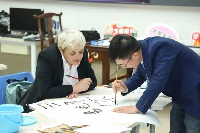 在随后的“中外青年学者工作坊”中,上外国际文化交流学院副教授黄建秦和华东师范大学非物质文化遗产传承与应用研究中心特聘研究员方云带领现场国际学生体验中国书法和上海土布贴画艺术。