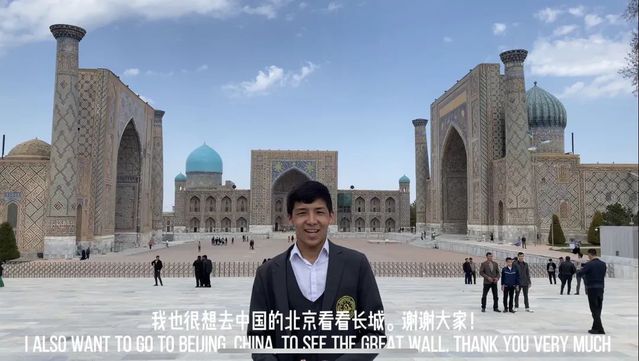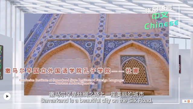 学员杜娜在视频中结合撒马尔罕的名胜古迹介绍了城市悠久的历史和文化,在网络人气奖评选环节获得众多点赞,最终脱颖而出。