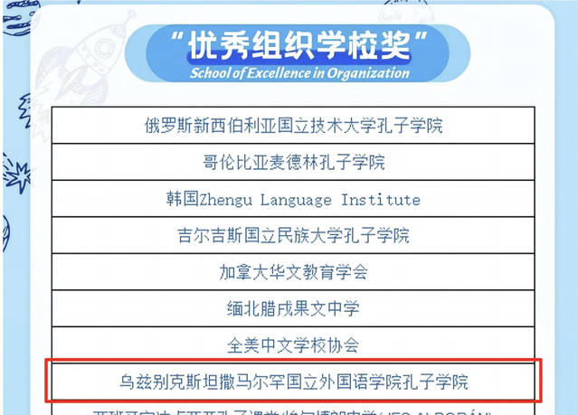 撒马尔罕国立外国语学院孔子学院在活动评选出的六大奖项中荣获四个奖项: