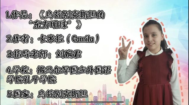 学员卡米拉在视频中用中文介绍了塔什干电视塔,将其比作乌兹别克斯坦的“东方明珠”,并欢迎各国的朋友们来到乌兹别克斯坦,获得了最佳外语奖;
