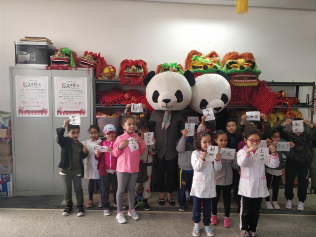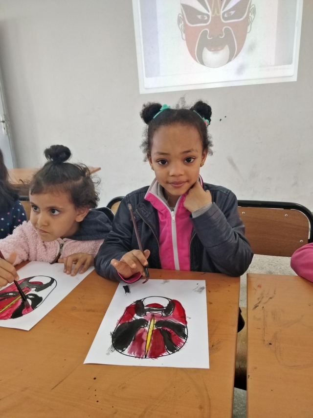贝拉祖尔双语学校54名平均年龄为6岁的一年级小学生在5位教师的带领下,来到哈桑二世大学孔子学院。孔院教师与志愿者为他们准备了别开生面的汉语体验课以及中国书法与京剧脸谱工作坊,这些小学生被分为三组,轮流体验三个课堂。在为他们特别设计的汉语课上,志愿者老师通过表演的方式,生动、直观地教会孩子们用汉语问好,并介绍了中国的十二生肖,孩子们反响热烈。