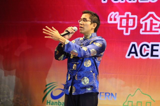选手们在中国国情知识问答环节中不分上下,展现了他们学习中国文化的热忱与认真。全场比赛最激烈的角逐,也是最精彩的奋战,毫无疑问就是才艺表演环节了。作为大学组唯一一位演唱歌曲的选手,邓宁思身穿一袭侠客黑袍,江湖气十足地为大家奉上了一曲《沧海一声笑》,经典的旋律与现代的说唱交替上演,悲怆的歌词与霸气的演绎浑然一体,全场观众和着节奏拍起了手,时而高昂,时而悲壮,剧场仿佛变成了一个大江湖。