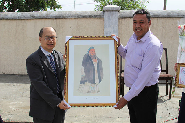刘涛向四所职业高中的16位学生发放了“撒马尔罕孔子学院优秀学员”奖状,向本土教师李峰(Sunnatullo Xatamov)颁发了“撒马尔罕孔子学院优秀教师”奖状,向四所职业高中的校长赠送了礼物《孔子行教图》和感谢信,感谢他们对汉语教育事业的支持。