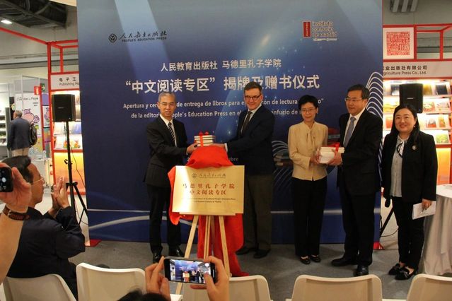 当地时间2023年10月4日,“人民教育出版社马德里孔子学院中文阅读专区”揭牌及赠书仪式在马德里西班牙国际图书展览会(Liber)上举行。中国驻西班牙大使馆教育参赞赵伟民、人民教育出版社党委书记、社长黄强、汉语编辑室主任施歌、马德里孔子学院外方院长杨德(Andreas Janousch)以及中方院长陆恺甜出席了此次仪式。
