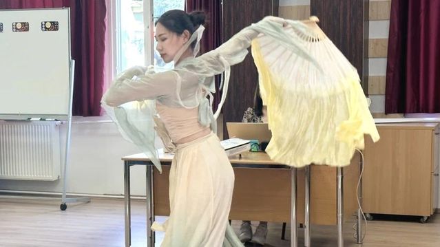 孔院国际中文教育志愿者侯雨含和杨紫涵带来的开场表演古筝独奏《青花瓷》、飘扇舞《西厢寻他》引得现场赞叹纷纷。