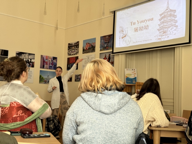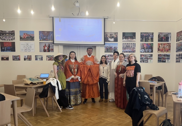 国际中文教师张思羽带领学生以“我品尝过的中国食物或买过的中国产品”为主题进行讨论,从筷子到中国品牌手机,学生们感受到“贸易畅通”使世界更为互利共赢;学生身着特色服装,以“我眼中的中国人物”为题各抒己见,来自赛格德大学生物学专业的钟可柔同学从专业角度为大家介绍了中国科学家屠呦呦的学术贡献,并联系到今年赛格德大学诺贝尔医学奖获得者卡塔琳·考里科(Katalin Karikó)教授,为大家展示了中匈在生物学上的发展。