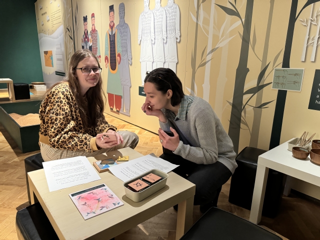 国际中文教师李建勇通过故事在线上为中文零基础学习者讲述了“丝绸之路”的历史背景,同学们则带着老师设计的任务,来到博物馆分别对秦代和汉代展馆进行了“寻宝式”观展,寻找故事中涉及的汉字、兵马俑发型、古代钱币等。