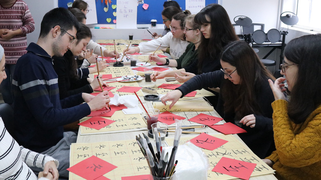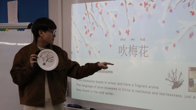 冬至活动以观看中国冬季节气文化短片为开始,让学生们简要了解中国人的冬季文化生活。紧接着国际中文教师胡安为学生们讲解了汉字“冬”与“至”的含义,并详细介绍了中国人的冬季养生文化和中国南北方的冬至习俗。胡安以冬至传统习俗“画九”为题,带领学生们体验了简易版的“画九”——吹梅花。一棵棵傲然挺立的梅花树,一朵朵鲜艳的梅花在学生们的盘子上渐渐展开。学生阿玛利亚·吉安娜库拉(Amalia Giannakoula)兴奋地表示:“冬至那天我要在家里挂上一幅梅花树,一天点上一朵红梅,期待点满81朵后春天的到来。”接下来,胡安带领学生们体验了中国的书法艺术并教大家在红纸上写下了“冬至”二字,祝愿所有人在岁末寒冬的时节里平安、健康。学生基里亚基·莫伊西亚杜(Kyriaki Moysiadou)说道:“孔子学院的这次活动让我充分了解了中国的冬季文化,太精彩了!这些故事就像一幅幅生动的画作,深深地嵌入我的脑海。”