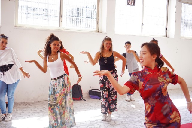 正当“东方节”活动进行得如火如荼时,中国展区又迎来了一批特殊的游客,他们是那不勒斯省诺贝尔高中的30名学生。他们一齐加入了中国展区的各个活动中,陈雪老师带领他们学起了中国古典舞——孔雀舞。同学们学得十分认真,有模有样,多人齐舞的盛大场面吸引了过路游客的侧目,有的甚至一起加入到了舞蹈队伍中。