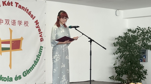 匈牙利赛格德大学孔子学院下设孔子课堂厄特沃什中学学生姜珂妤(Gulyas Janka)作为获奖学生代表发言。她表示,孔院不仅为他们提供了高质量的中文课,还通过丰富多彩的活动帮助他们了解古代和现代中国、探索文化多元性。这份奖学金是赛大孔院、厄特沃什高中各位老师们共同努力的结晶,她与同学们会带着这份荣誉与情谊,继续努力学习中文,成长为中匈友好的青年力量。