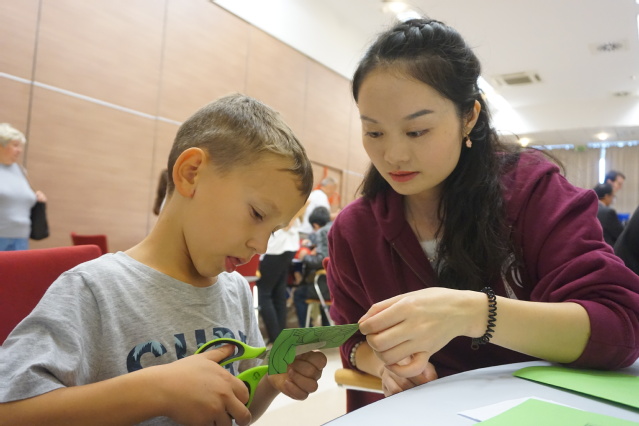 参与者们有的聚精会神地剪纸,有的在老师指导下写汉字,还有的在与赢得的中国特色纪念品拍照留念。
