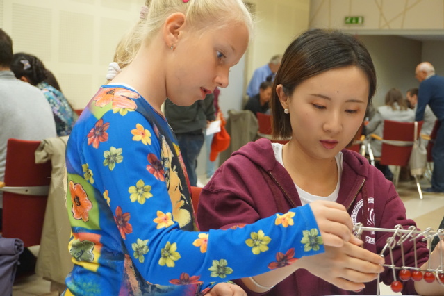 本次活动分为两个环节,第一环节为“中国文化体验”。赛格德大学孔子学院共设置七个体验区,满足不同年龄层次需求。其中既包括传统的民俗活动:书法、熊猫剪纸、中国结、京剧脸谱填色、扇面涂色,也包括传统趣味游戏如踢毽子、五子棋;还有充满中国元素的传统益智游戏如鲁班锁、九连环、华容道等。