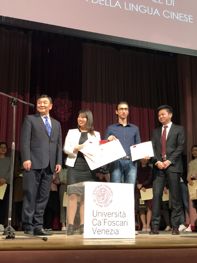 当地时间10月12日,第六届意大利暨圣马力诺汉语教师教学技能大赛在威尼斯大学Ca’Foscari校区拉开帷幕。本次大赛由中国驻意大利使馆教育处主办,中国国际广播电台意大利空中孔子课堂和威尼斯大学孔子学院协办。意大利使馆教育处参赞罗平任大赛主席,那不勒斯东方大学孔子学院中方院长徐海铭等中意七位专家担任大赛评委。比赛分中方汉语教师和意方本土汉语教师两个组别进行。本次大赛中,那不勒斯东方大学孔子学院汉语教师徐欣和意大利本土汉语教师刘思哲(Salvo Montarolo)与20位中意汉语教师同台角逐,最终那不勒斯东方大学孔院选派的意方汉语教师刘思哲获得意方本土汉语教师组别金奖,徐欣获中方汉语教师组别纪念奖。