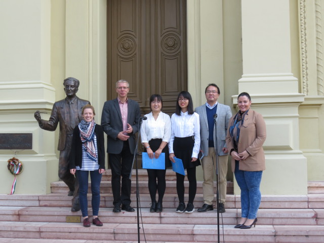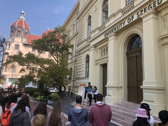 当地时间10月8日,匈牙利著名诗人山陀尔·裴多菲(Sándor Petöfi,1823-1849)爱情诗歌《我愿意是激流》中匈双语朗诵活动在赛格德大学校长办公楼前的广场举行,这是大学秋季文化节的一个重要环节。孔院外方院长李察德首先向观众介绍了活动背景,然后邀请中匈朗诵者——孔院公派教师章秀文和上海外国语大学匈语系学生王雨蝶出场。