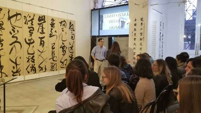 特别值得一提的是,展览第二日下午,那不勒斯东方大学亚非地中海研究系Chiara Viscounti教授带领60多位来自考古、历史、汉语语言文学和国际际政治专业的硕士研究生前来观展。刘研院长向他们介绍了中国文字的演变历史,不同字体独有的区分性特征及其传递的不同的美学旨趣。讲座结束后,刘研院长逐一回答了来自欧洲、美洲和亚洲等不同文化背景的师生提出的问题。整场讲座气氛活跃,徐海铭教授的翻译诙谐有趣,现场笑声不断。通过现场观摩书法作品、聆听书法家的作品讲解和创作感受,外国学子对汉字演变历史、书法起源以及如何欣赏中国书法的美学特征有了进一步了解。可以说是,听君一讲座,胜读不少书。