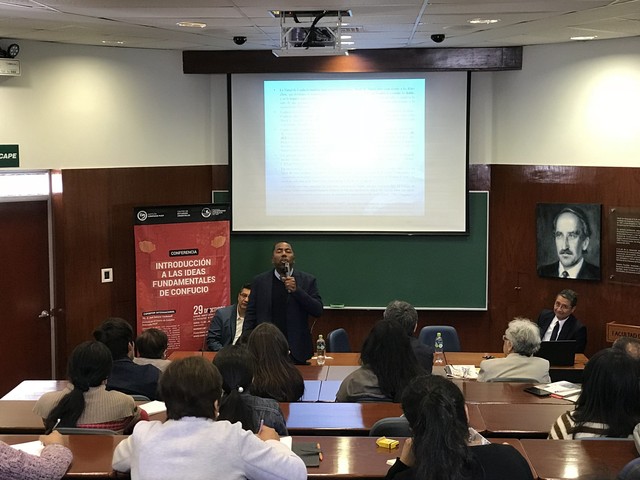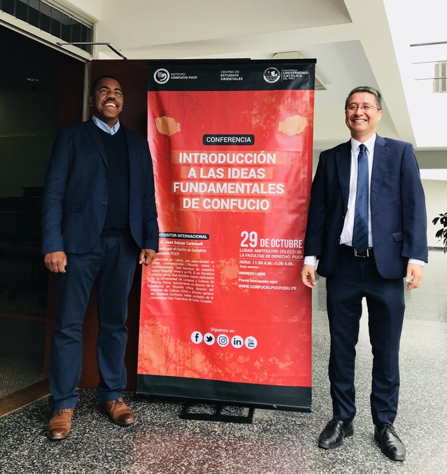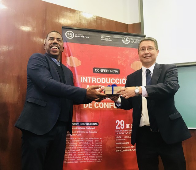 当地时间10月29日,秘鲁天主教大学孔子学院在法学院礼堂举办“孔子哲学思想讲座”。本次讲座主讲人为何塞·萨拉查博士(José Salazar Carbonell)。秘鲁天主教大学孔子学院外方院长邓如朋、孔院学生,以及对孔子哲学思想感兴趣的秘鲁民众等100余人出席了本次讲座。