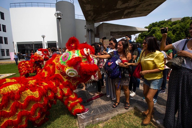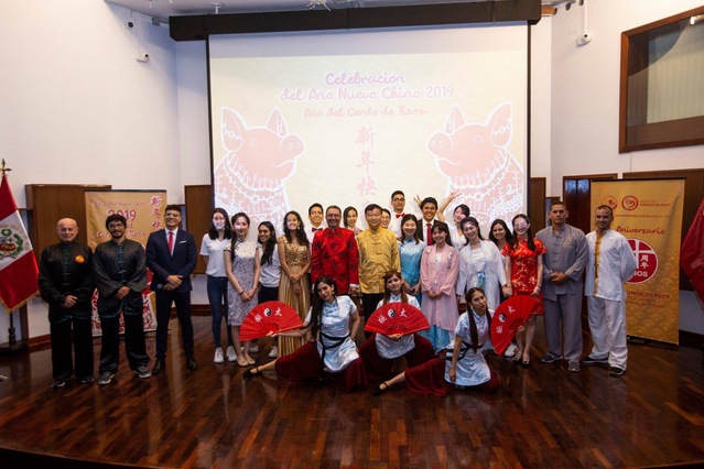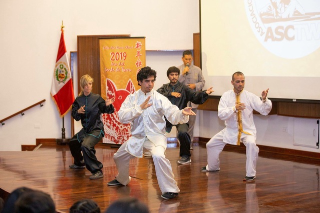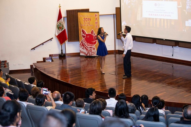 春节,作为中国最重要的传统节日,表达了中国人对新年的期盼和憧憬,春节更是中国人与家人共聚一堂、举杯同庆的美好节日。秘鲁当地时间2月1日下午12时30分,秘鲁天主教大学孔子学院成功举办以“金猪贺岁”为主题的春节联欢会。中国驻秘鲁大使馆文化参赞朱晓燕,以及即将接替朱晓燕的新任文化参赞贺踊受邀出席了本次春节联欢会。孔子学院中方院长黄皓、秘方院长邓如朋、汉语教师及志愿者、秘鲁天主教大学及孔院师生、中秘各媒体记者,以及热爱中国文化的利马当地民众等400余人一同观看了本次演出。本次演出还邀请了南美气功协会和南美陈式太极拳协会成员为联欢会带来精彩的中国传统武术表演。