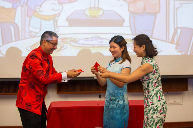 在精彩的表演节目之间,联欢会还设置了两轮抽奖环节,贺踊参赞和黄皓院长分别抽出三位幸运观众,并送上孔子学院精心准备的新春贺礼。