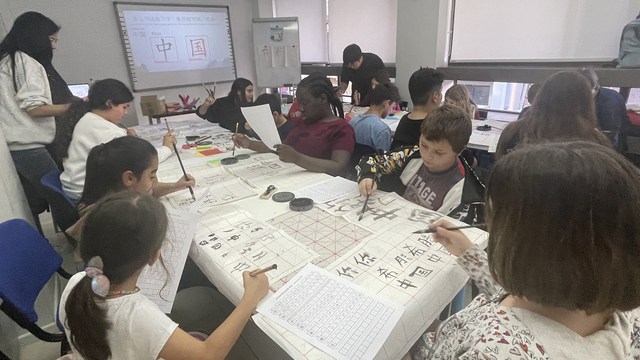 当地时间4月25日,在国际中文教师王颖的组织下,中方院长鲍晓英、希方院长罗兰以及国际中文教师吕宜文一行来到孔院索斯村教学点,举行了一场中文书法体验活动。