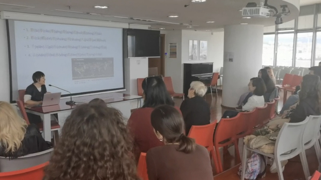接着,罗兰以“中文和希腊语”为题对中文和希腊语的构词、句法和习语进行了对比讲解,并介绍了自己学习中文的心得体会。最后,鲍晓英以“蝴蝶爱人梁祝:中国的罗密欧和朱丽叶”为题,介绍了中国的爱情故事《梁山伯与祝英台》,并现场教授学生演唱《梁祝》。