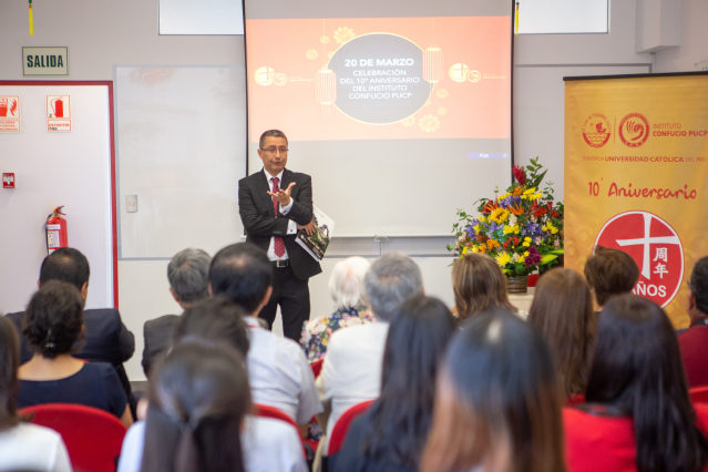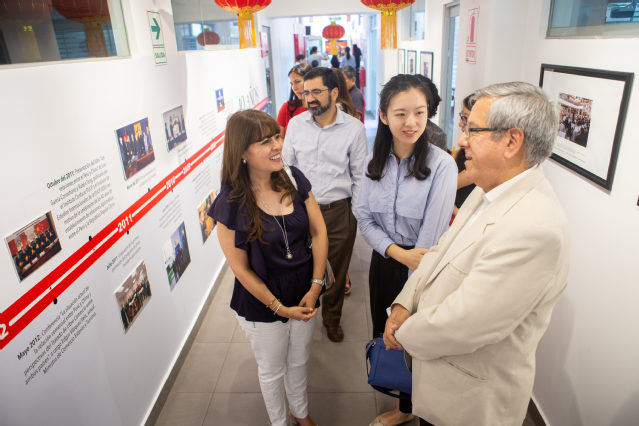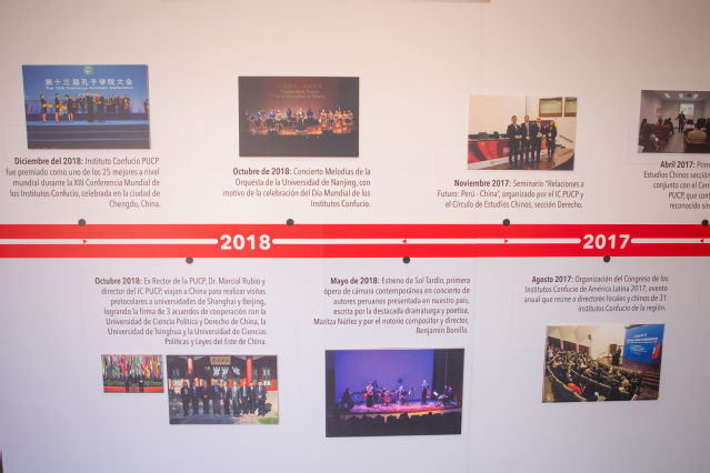 当地时间2019年3月20日中午,秘鲁天主教大学孔子学院成功举办十年发展图片展览揭幕仪式。作为秘鲁第一家孔子学院,秘鲁天主教大学孔子学院始建于2009年3月20日。为了纪念和欢庆这一特殊的日子,孔子学院积极筹备,甄选了五十幅珍贵照片,再现孔院发展经典瞬间,描绘孔院发展历程,讲述孔子学院2009-2019十年间的巨大发展与变化,宣传孔院在秘鲁为汉语教学和中华文化推广做出的成绩和贡献。