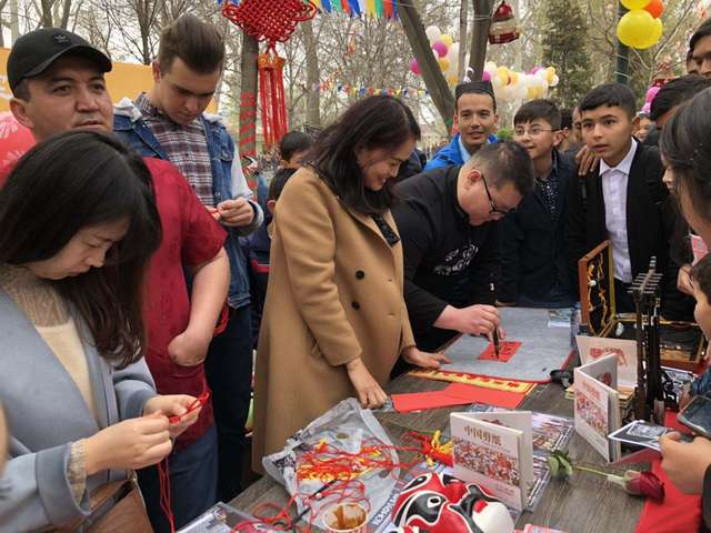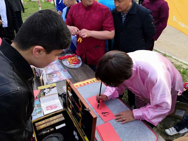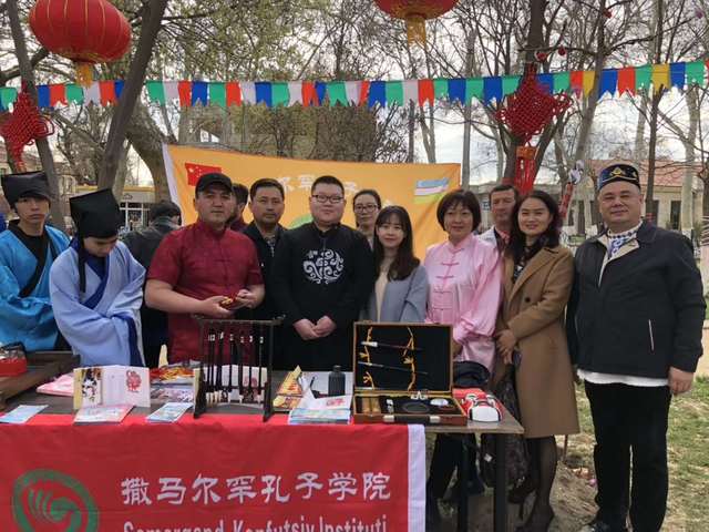 撒马尔罕国立外国语学院孔子学院积极融入当地生活,带着具有中国传统特色的文化项目—中国结、书法、剪纸、茶艺来到城市中心广场与市民共庆节日。