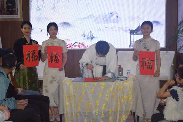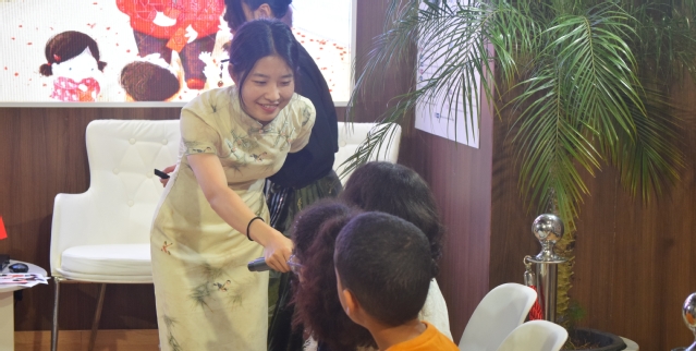 在书展现场,孔院国际中文教育志愿者潘虹羽向观众们介绍了中国的传统节日,并与观众互动,赠出了中国结、红包、小灯笼等特色小礼品;刘瑶佳现场展示了中国书法,激起了观众对汉字的浓厚兴趣。