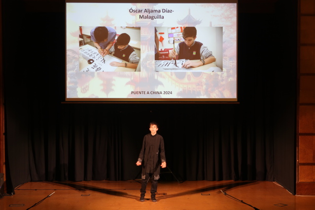 马德里孔子学院选派的奥斯卡(Óscar Aljama Díaz-Malaguilla)在中学组比赛中获第一名,将代表西班牙参加在中国举行的全球总决赛。奥斯卡在比赛中分享了自己从6岁开始就有的中文梦想,仅学了两年中文的他,在全家人的支持下,积极备赛,他的书画作品“室雅无须大,花香不在多”体现出了他对中国文化的理解。