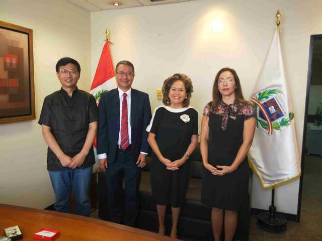 当地时间3月7日上午,秘鲁天主教大学孔子学院外方院长邓如朋(Ruben Tang)和中方院长黄皓到访秘鲁外交部(Ministerio de Relaciones Exteriores)。人力资源开发司(Oficina General de Recursos Humanos)玛丽亚·特雷莎·梅里诺大使(María Teresa Merino)和人事培训处(Oficina de Capacitación de Personal)安娜·加芙列拉·巴斯克斯参赞(Ana Gabriela Vasquez)热情接待了两位院长,双方就加强两个机构之间的合作进行了座谈,并签署了相关培训协议。