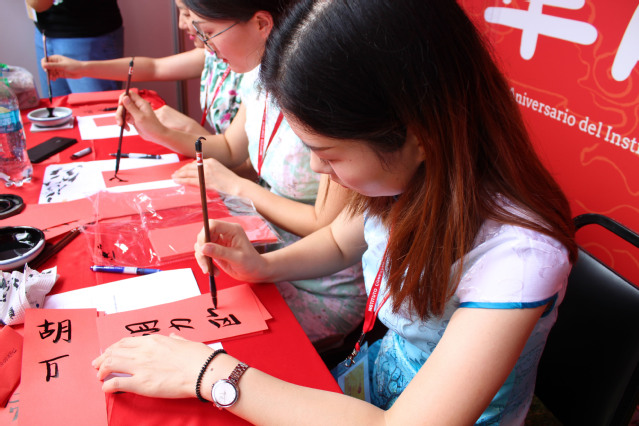 中国文化展示区首先进行了茶艺表演。汉语教师们身着旗袍,分工协作,一位用西语为大家介绍了中国的茶文化和泡茶品茶方法,另一位则具体操作演示。古朴的茶具、考究的步骤和仪式感,以及教师们自带的优雅气质,令旁观者入迷神往。那一杯杯热腾腾的红茶和绿茶,让大家品尝了茶的清香,更体验了中国茶文化的魅力。
