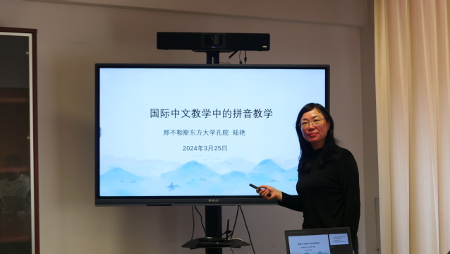 第二期分享人是孔院国际中文教师陆艳,主题为《国际中文教学中的拼音教学》,她结合国内语文课堂的拼音教学和英语中的国际音标教学,对拼音教学提出了自己的思考和建议。
