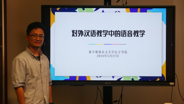 第四期主讲分享人是孔院国际中文教育志愿者唐懿德,主题为《对外汉语教学中的语音教学》。教师依据国际中文教学通用课程大纲中的语音学习内容探讨各阶段语音教学要求。他通过对比意大利字母和中文声母的发音特点,提出了针对意大利学生的语音教学顺序和方法,同时还设计了相关教学实验。