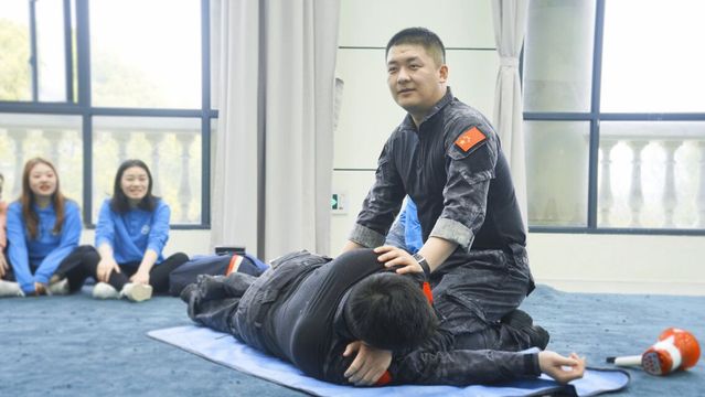 下午的课程中,学员们在教官的指导下进行了安全知识实践,学习了心肺复苏等救援方法,亲自体验了如何使用止血带、如何使用夹板,还掌握了被抓住手部、头部、背后束缚等不同侵害事件的应对方法。