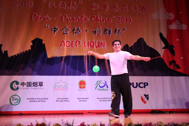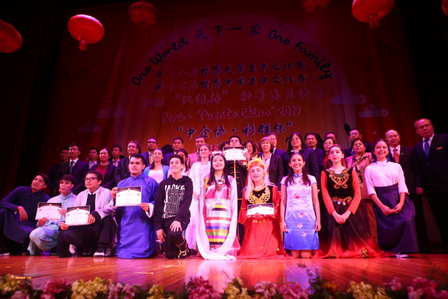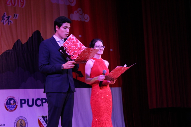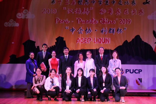 当地时间2019年6月1日,“汉语桥”世界中学生、大学生中文比赛秘鲁赛区决赛暨秘鲁第六届“中企协·利群杯”中文比赛在首都利马中秘友谊馆隆重举行。本次比赛由孔子学院总部、中国驻秘鲁大使馆主办,秘鲁天主教大学孔院承办,里卡多帕尔玛大学孔子学院、圣玛丽娅天主教大学孔子学院和皮乌拉大学孔子学院,以及若望23世秘中学校、中华三民联校、孔夫子学校共同协办,秘鲁中资企业协会和浙江中烟工业有限责任公司提供赞助。出席本次比赛的嘉宾有中国驻秘鲁大使馆临时代办和政务参赞李昀、文化参赞贺踊、商务参赞郝沁梅,秘鲁中资企业协会会长孔爱民和各中资企业12位领导,以及秘鲁华裔华侨组织的负责人等等。中秘友谊馆内,400名观众济济一堂,聆听学子话天下大同,欣赏学子展中华才艺。