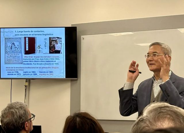 讲座中,陆教授生动讲述了中国和西班牙交往的悠久历史,从《明心宝鉴》(Espejo rico del claro corazón)作为首部被译介至西方的中华古籍,到马尼拉大帆船时期两国文明间的交流,展现了中西文化交流的深厚底蕴。他特别提到,孔子(Confucio)和塞万提斯(Cervantes)作为两国文明的代表人物,其名字中共有的字母“c”与“n”巧妙寓意了两国文化共通之处,而差异之处则彰显了文化的多样性与独特性。总的来说,中西文化虽异大于同,但正是这些差异构成了世界文化的丰富多彩。