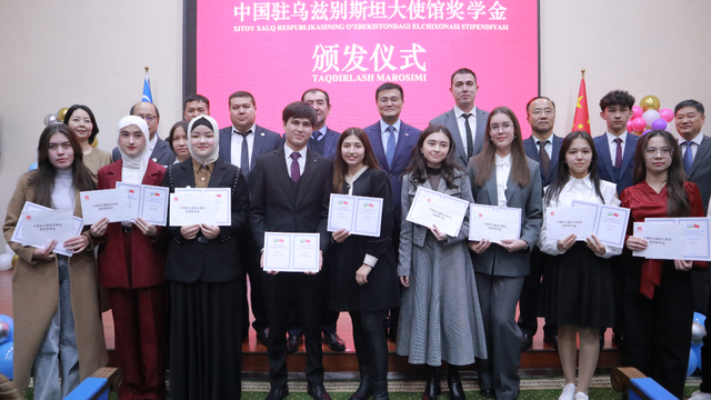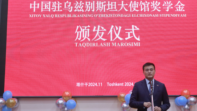 当地时间2024年11月30日, 乌兹别克斯坦撒马尔罕国立外国语学院孔子学院(以下简称“撒外孔院”)师生赴首都塔什干,参加由中国驻乌兹别克斯坦大使馆举办的“大使馆奖学金”颁奖仪式。