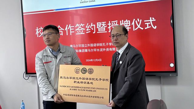 当地时间2024年12月4日,乌兹别克斯坦撒马尔罕国立外国语学院孔子学院(以下简称:撒外孔院)与中能建国际集团撒马尔罕水泥外资有限公司在厂区会议室举行了校企合作备忘录签约暨授牌仪式。