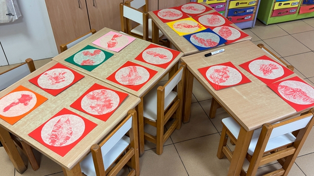 随后,孔院教师们带领孩子们体验了“年年有鱼(余)——雕版年画拓印”活动。该活动由国际中文教师吕宜文策划,灵感来源于中国传统雕版年画。老师们耐心指导,孩子们用一双双灵巧的小手和天马行空的想象力,创作出一幅幅生动可爱的锦鲤雕版。孩子们拿着自己的作品,脸上洋溢着喜悦与自豪。