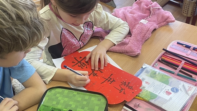 同时,三位教师还带领学生动手剪纸、制作窗花,感受中国剪纸艺术的魅力。学生们用红纸裁剪出许多漂亮、寓意吉祥的作品,并布置在教室中,营造出浓厚的节日氛围。学生们还学习了“福”字 ,并在老师的指导下创作出别致的“福”字和对联,贴在书本中,让新年的美好祝愿长伴身边。