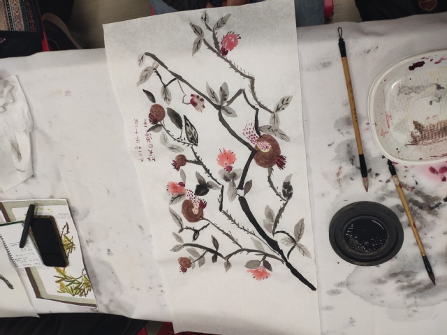 中国画课程更有意思的地方在于,每每讲到一幅新的作品时,韦老师总会准备一个又一个生动有趣的小故事,还不忘教授汉语知识。通过讲解作品背后的故事寓意以及相关俗语,能够更加深切地传达作者创作的真情实感,丰富学生对于这一事物的认识,同时激起学生对汉语的好奇心。例如,在讲解石榴的画法之前,韦老师与学生分享了和杨贵妃有关的“拜倒在石榴裙下”的小故事,学生们顿时石榴有了新的认识,下笔多了一分神韵;画梅花时,讲述了“梅花香自苦寒来”的哲学含义,会中文的学生当场认真做起了笔记。后来几次讲国画,学生都特别期待韦老师每次课上讲解文化知识、典故和成语故事。