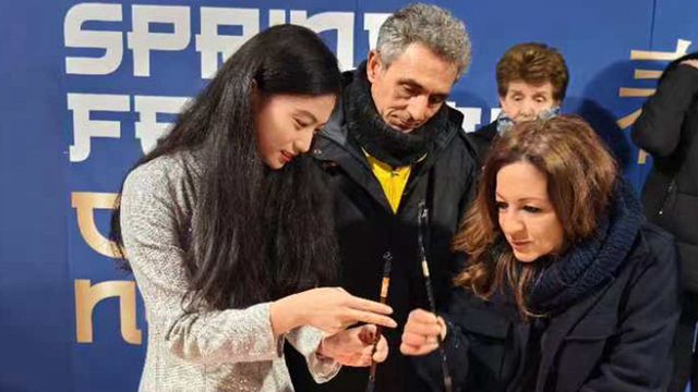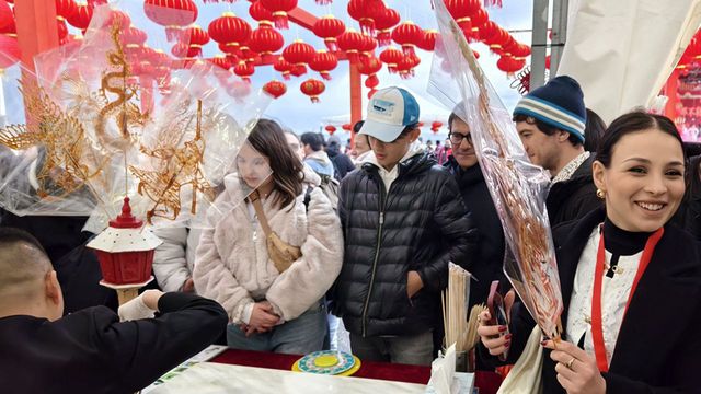 活动现场设置了丰富的文化体验区,吸引了众多参与者。在书法区,参与者挥毫泼墨写“福”字,维奇南扎市长也完成了“福”字的书写,并称“希望中国的‘福’能为市民们带来好运气”。汉服体验区中,意大利青年身着华美汉服,演绎跨文化风韵;青花瓷绘画、剪纸艺术与灯笼制作区人头攒动,茶艺展示区则以袅袅茶香传递东方美学。活动尾声,中意嘉宾与市民共同聆听新年钟声,互赠祝福,为庆典画上温情句点。